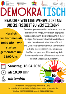 Die Initiative "Gemeinsam für Demokratie" lädt alle Interessierten herzlich ein, um genau darüber zu sprechen. Ab 10:30 Uhr ist der Tisch reserviert und man kann in Ruhe ankommen. Unsere Diskussion startet um 11:00 Uhr.
